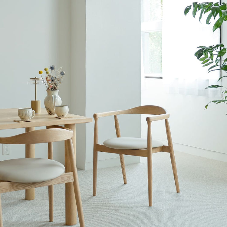 背もたれと肘かけが一体になったアッシュ無垢材を使用したアームタイプにPVCレザーを使用した丸いフォルムが少しかわいらしさを感じる座面を組合わせたダイニングチェア。フレームには無垢材の素材そのものの持つ、色合いや木目を活かしたウレタン塗装でモダンな風合いに仕上げ、背もたれ部分は丸みをもたせることで包みこまれるような安心感を実現。家族が集まる場所を居心地の良い空間にしてくれます。友人や家族との大切な時間、食後のコーヒータイムまでダイニングでゆっくり寛いでみてはいかがでしょうか。 |