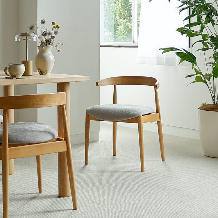 木目の美しいアッシュ無垢材を使用した背もたれと肘かけが一体になったハーフアームとさらさらした肌触りのファブリックを使用したダイニングチェア。繊細な木目が特徴のアッシュ材を使用したダイニングチェア。チェアの座面部分は程よい硬さに仕上げていますので、長い時間座っていても疲れにくい設計に。またさらさらとした肌触りのファブリックは1年を通して爽やかにご使用頂けます。座ったときに感じる、“包み込まれた感じ”。家族やお友達と過ごすダイニングでの時間が長くなりそうですね♪ |