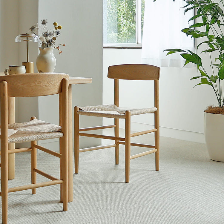 「ペーパーコード × オーク材」を使った伝統的な名作チェアのようなデザインのダイニングチェア。毎日の食卓、家族との会話、お友だちを招いてのお食事、、、そのすべての時間に寄り添うのが、ダイニングチェア。見た目は「おしゃれ」だけど、それだけでは心地よい時間や暮らしはつくれません。北欧家具のように意匠の美しさと機能のバランスがとても重要。北欧の椅子は、どれも驚くほどシンプル。でも目を引くほど美しく感じるのは余計なものを削ぎ落し、使う人の快適さを追求することが含まれているから。こちらのチェアは、そんな「見ていても」「使ってみても」心地よく過ごせるチェアーとなっています。 |