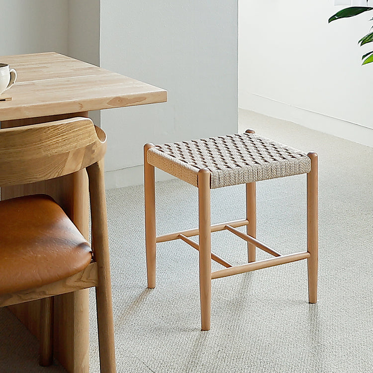 ビーチ無垢材とペーパーコードを使ったスツールの魅力。ビーチ無垢材は木目がきめ細かく、色味も明るくやさしいため、空間に自然な温かみを与えます。硬くて粘りがあり、反りや割れが起こりにくい特性を持つため、スツールのように日常的に負荷がかかる家具でも長く安心して使えます。また、使い込むほどに表情が深まり、経年変化を楽しめるのも無垢材ならではの魅力です。 |
