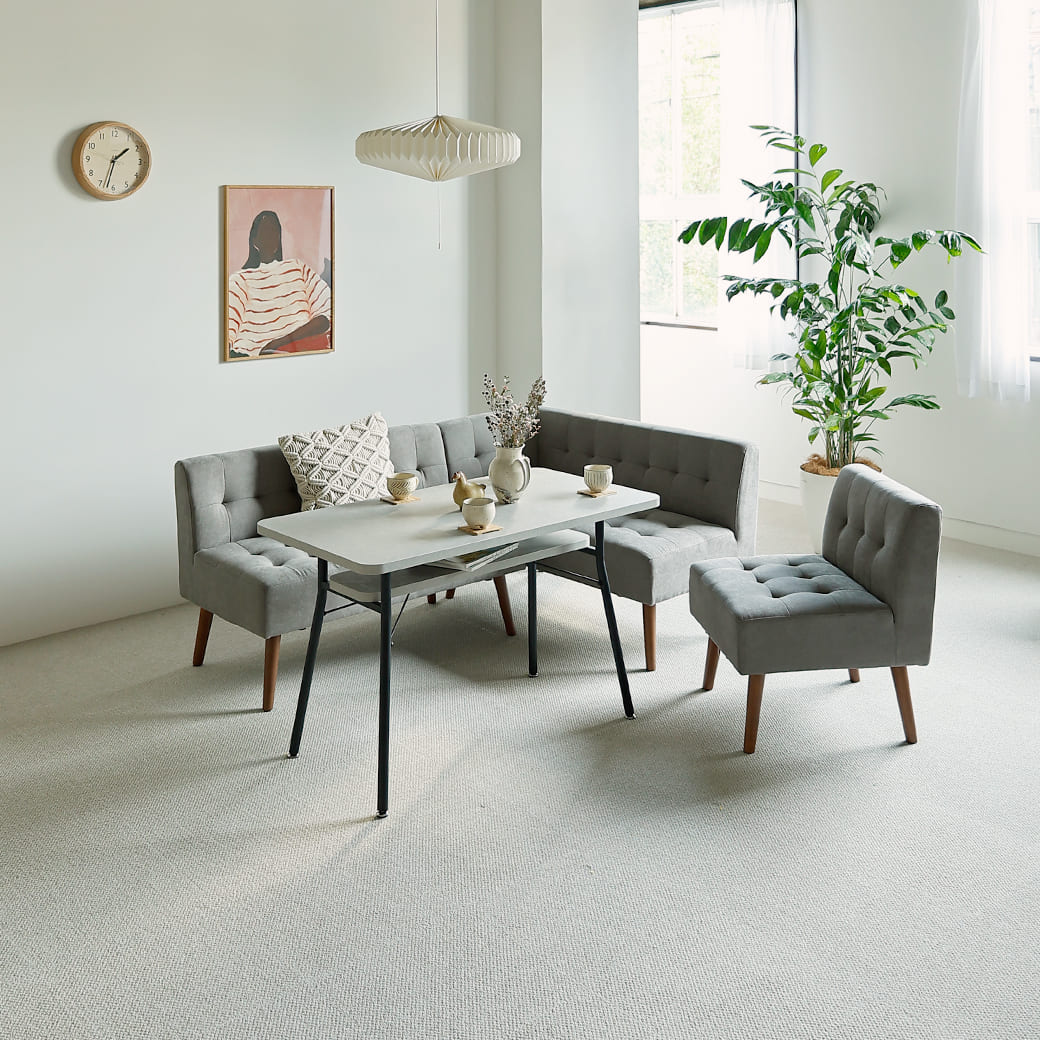 食事もできるダイニングとして、またリビングでくつろぐようにソファとしてもくつろぐこともできるソファーダイニング。幅110cmのダイニングテーブルとファブリックのナチュラルさとスラリと伸びた少し長めの脚部が北欧デザインを感じさせるカウチソファー、2人掛けソファー、1人掛けソファーのソファーダイニング4点セット、mild(ミルド)。ダイニングテーブルのカラーはナチュラルとブラウン、ストーングレーの3色からお選びいただけます。 |