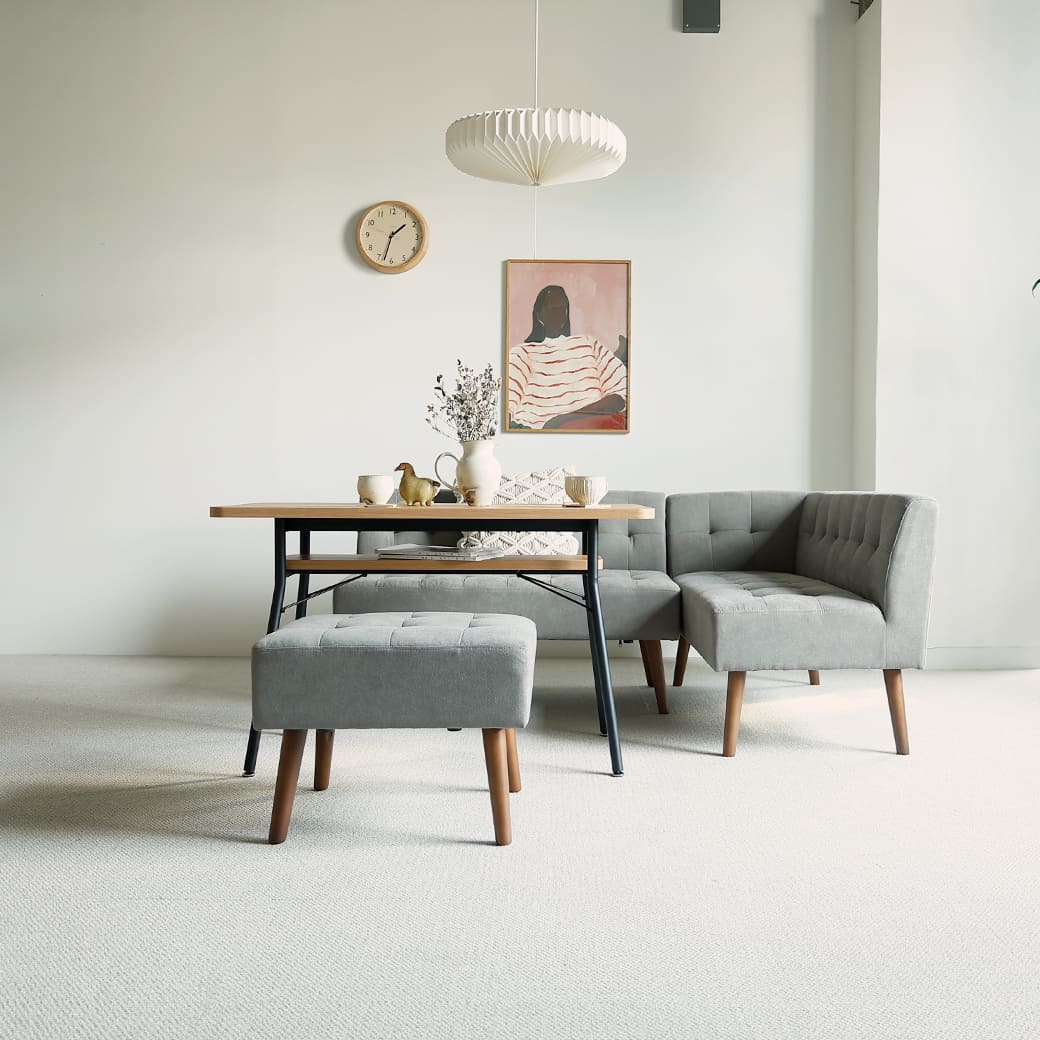 食事もできるダイニングとして、またリビングでくつろぐようにソファとしてもくつろぐこともできるソファーダイニング。幅110cmのダイニングテーブルとファブリックのナチュラルさとスラリと伸びた少し長めの脚部が北欧デザインを感じさせるカウチソファー、2人掛けソファー、オットマンのソファーダイニング4点セット、mild(ミルド)。ダイニングテーブルのカラーはナチュラルとブラウン、ストーングレーの3色からお選びいただけます。 |