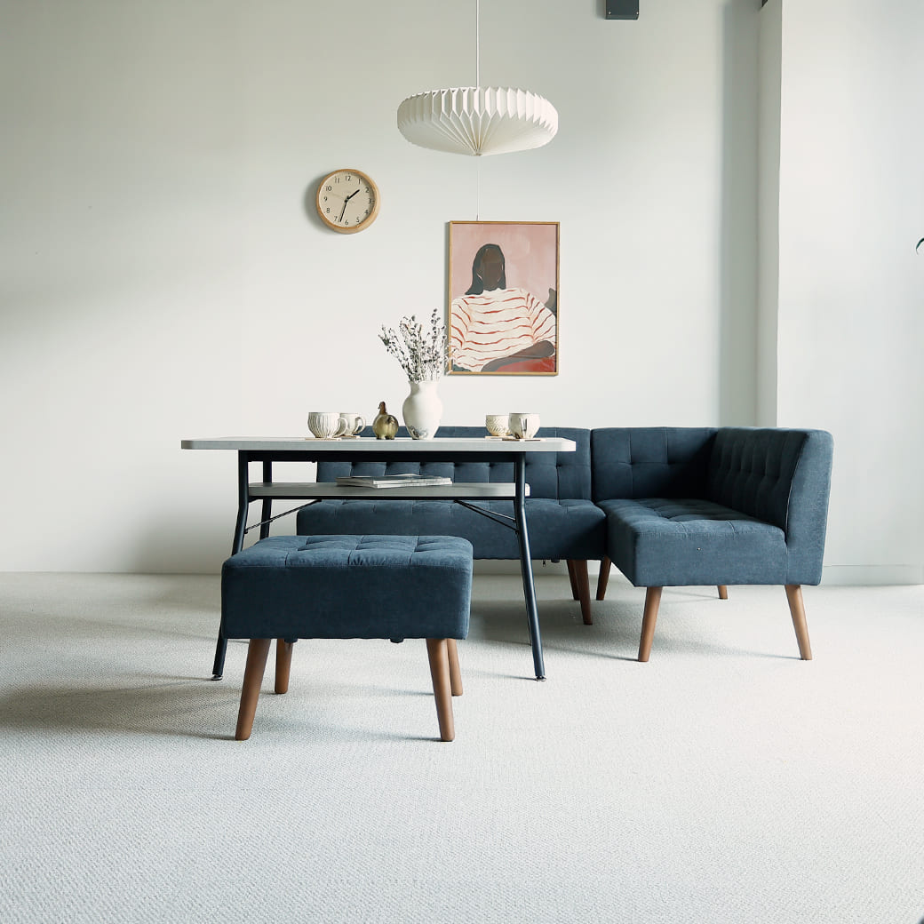 食事もできるダイニングとして、またリビングでくつろぐようにソファとしてもくつろぐこともできるソファーダイニング。幅110cmのダイニングテーブルとファブリックのナチュラルさとスラリと伸びた少し長めの脚部が北欧デザインを感じさせるカウチソファー、2人掛けソファー、オットマンのソファーダイニング4点セット、mild(ミルド)。ダイニングテーブルのカラーはナチュラルとブラウン、ストーングレーの3色からお選びいただけます。 |