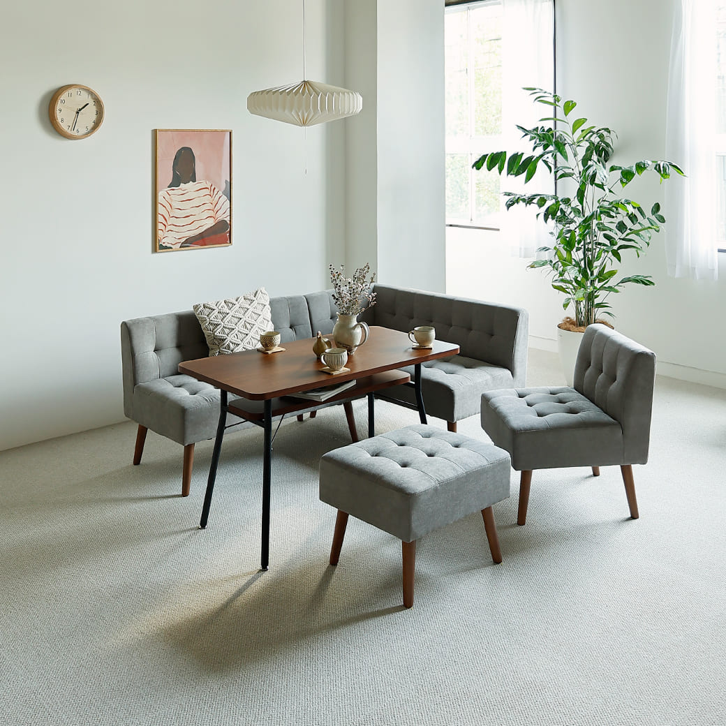 食事もできるダイニングとして、またリビングでくつろぐようにソファとしてもくつろぐこともできるソファーダイニング。幅110cmのダイニングテーブルとファブリックのナチュラルさとスラリと伸びた少し長めの脚部が北欧デザインを感じさせるカウチソファー、2人掛けソファー、1人掛けソファー、オットマンのソファーダイニング5点セット、mild(ミルド)。ダイニングテーブルのカラーはナチュラルとブラウン、ストーングレーの3色からお選びいただけます。 |