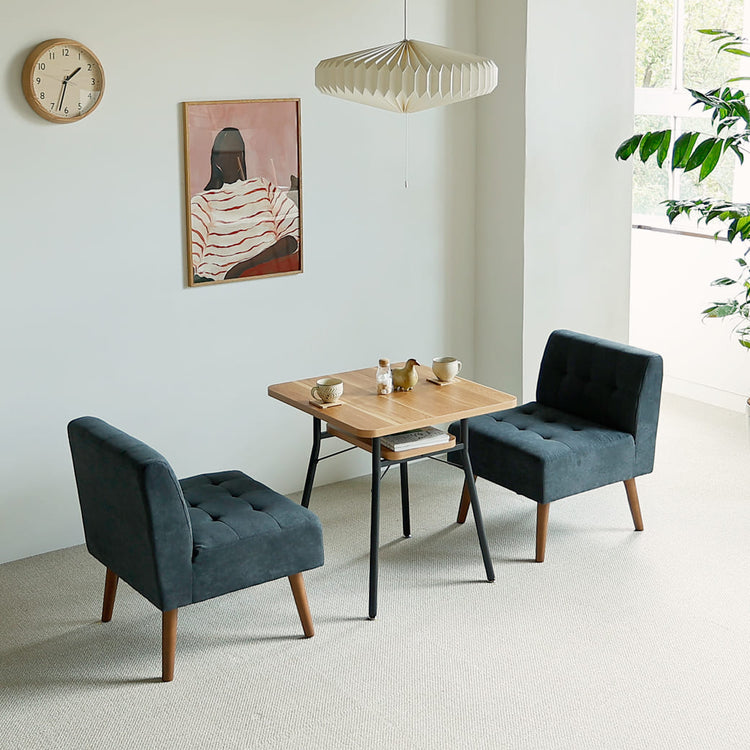 食事もできるダイニングとして、またリビングでくつろぐようにソファとしてもくつろぐこともできるソファーダイニング。幅65cmのカフェテーブルとファブリックのナチュラルさとスラリと伸びた少し長めの脚部が北欧デザインを感じさせる1人掛けソファー2台のソファーダイニング3点セット、mild(ミルド)。ダイニングテーブルのカラーはナチュラルとブラウン、ストーングレーの3色からお選びいただけます。 |
