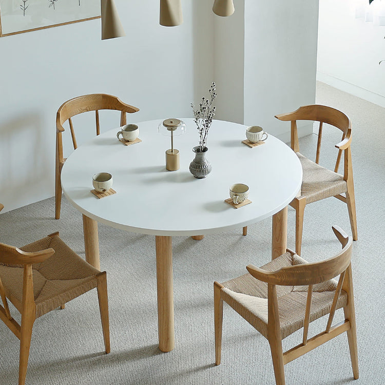 ホワイト天板とオークカラーの円柱脚が北欧モダンな食卓を演出してくれる直径120cmの円形タイプの国産ダイニングテーブル。特徴は直径120cmという広々使えるサイスの天板サイズ。家族4人で広々と食卓を囲むのはもちろんですが、お友だちがお家に来たときにスツールなどを置けば6人くらいで使用しても余裕のあるサイズ感となっています。 |