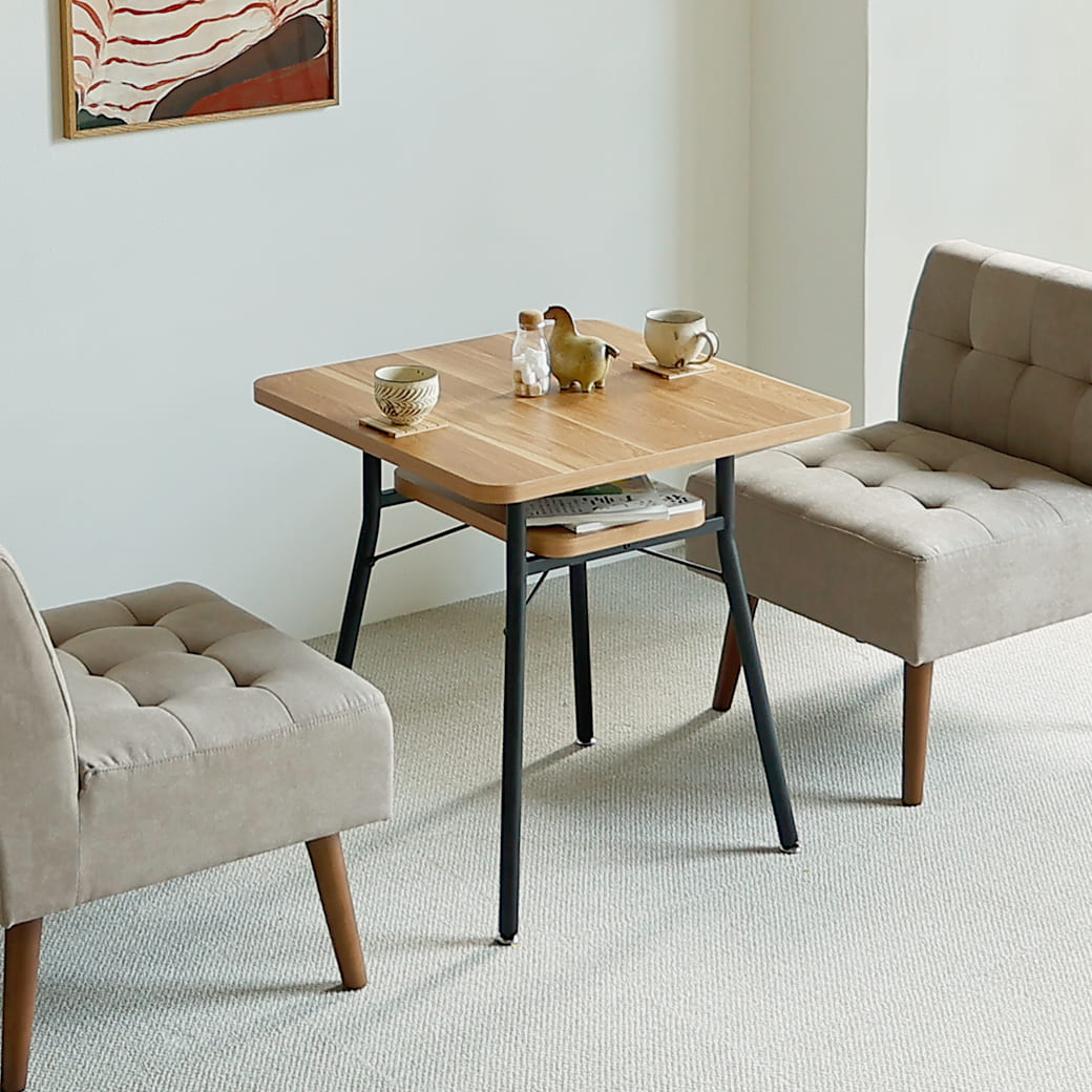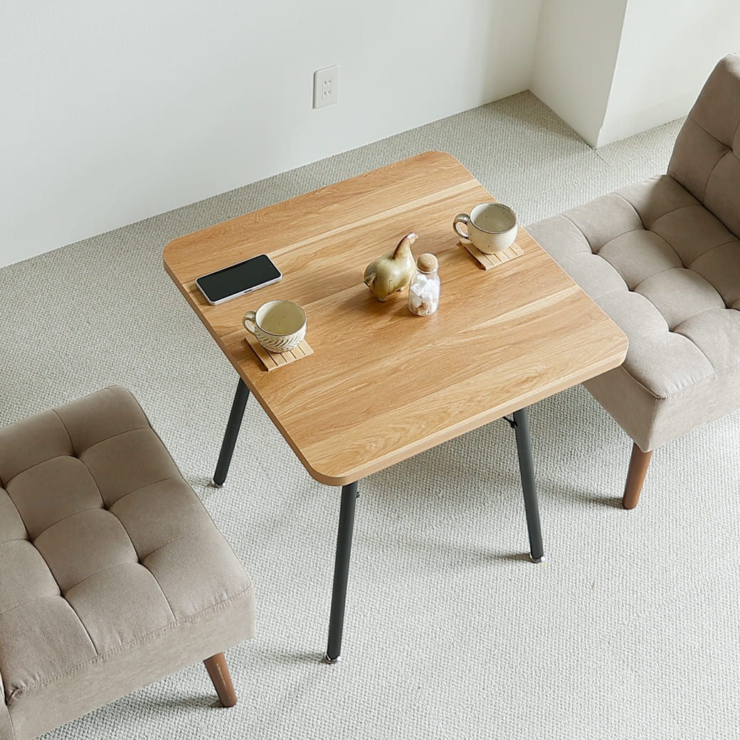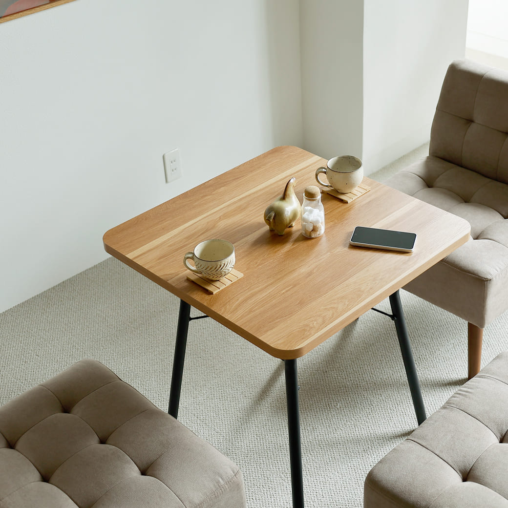 オットマンやスツールを使って3人くらいで団らん♪家族や友人が集まるダイニング。お食事をするイメージ、お家でパソコン作業したり、お友達がきたときにくつろぐスペースなど使用イメージは様々ですよね。こちらのダイニングテーブルのサイズは幅65cm×奥行き65cm×高さ68cm。1人での使用から2人の使用にちょうどいいサイズ。スツールやオットマンなどを置けば3人くらいでおくつろぎいただけますよ♪ |