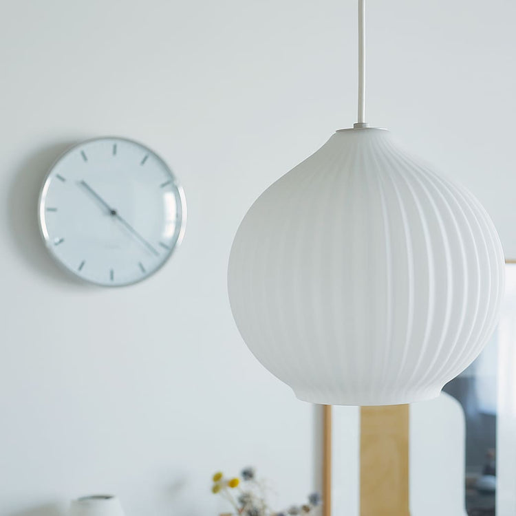 小さなたまねぎ「ペコロス」をデザインモチーフにしたペンダントライト。心を和ませ、穏やかな雰囲気を感じさせるデザインで、親しみやすく、丸みを帯びたフォルムが特徴ですよ。ドーム型のガラスシェードが可愛らしいペンダントライト。シンプルでありながら印象に残る丸みを帯びたシルエットに北欧建築のエッセンスを感じることができます。光源を和らげるマットな質感のガラスに施したのはふくらみではなく、削ったようなへこみ。 消灯時も生まれる細やかな陰影が甘くなり過ぎないバランスをお部屋をおしゃれな空間にしてくれますよ。 |