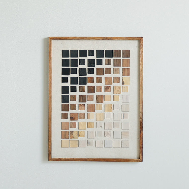 長年使いこまれた傷などをそのまま活かしたパイン古材をフレームなどに使用し、ダイナミックで重厚感溢れるアートパネルに仕上げています。こちらのアートは、パイン古材を使用したフレーム、そして様々な形とサイズにカットされた古材を並べて製作されたヴィンテージさを感じるアートパネルとなっています。よく見ると不規則に配列された古材には立体感があり、お部屋のどこに掛けてもインパクトを与えるほどの印象深いアートとなっています。 |