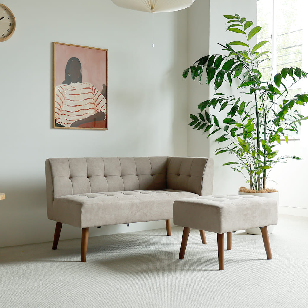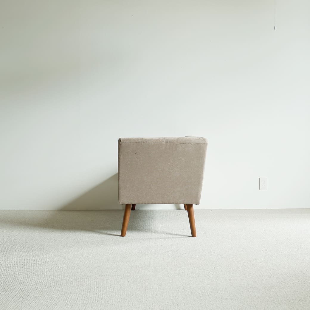 ヌケ感のあるスラリとした脚がお部屋の圧迫感を和らげてくれますよ。1人暮らしやワンルームなどの限られたスペースだからソファを置きたいけど、諦めている方にもピッタリのコンパクトサイズ。大きなソファを置くと、どうしてもお部屋が窮屈に感じてしまいます。そこでおすすめなのが、mild(ミルド)のカウチソファ。ベージュファブリックの淡い色のソファで、脚部がスラリと長いことでヌケ感が生まれてお部屋の圧迫感を軽減してくれますよ。 |