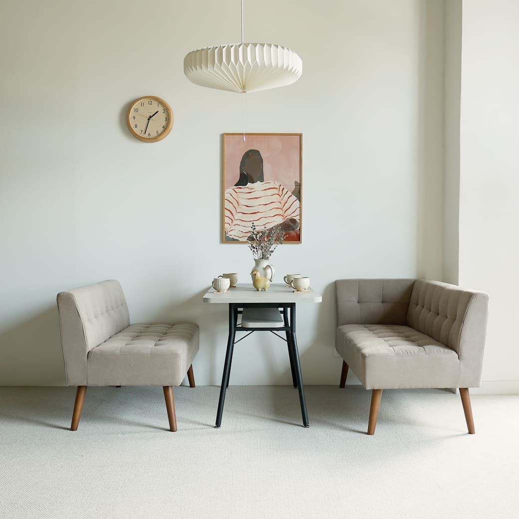 同シリーズに合わせて使えば、おしゃれなソファーダイニングの完成です。同シリーズのダイニングテーブルや2人掛けソファなどと合わせて使えば、統一感のあるナチュラルダイニングの完成ですね。ただ同系色のカラーでインテリアを揃えると無難にまとまりますが、単調になりすぎることもありますので、天然木を使った収納やポスターなどの小物に差し色を取り入れると、程よいメリハリが生まれて落ち着きのあるおしゃれな空間になりますよ。 |