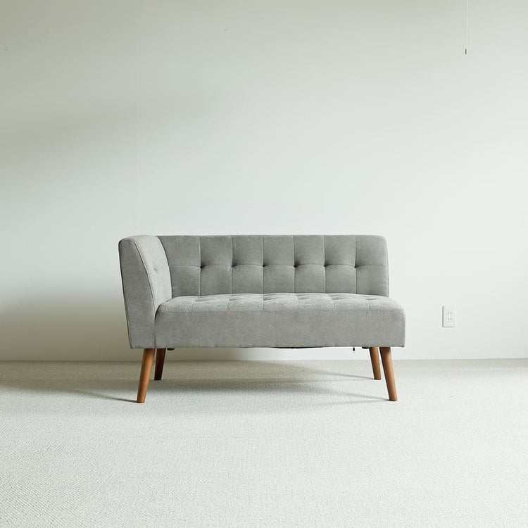 ヌケ感のあるスラリとした脚がお部屋の圧迫感を和らげてくれますよ。1人暮らしやワンルームなどの限られたスペースだからソファを置きたいけど、諦めている方にもピッタリのコンパクトサイズ。大きなソファを置くと、どうしてもお部屋が窮屈に感じてしまいます。そこでおすすめなのが、mild(ミルド)のカウチソファ。グレーファブリックで淡い色のソファで、脚部がスラリと長いことでヌケ感が生まれてお部屋の圧迫感を軽減してくれますよ。 |