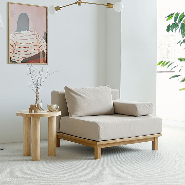 それぞれの暮らしに合わせて組み合わせられるのも「レクトユニットソファー」の特徴。 異なるタイプを合わせても座面はフラットに、さらに置き型タイプの肘掛けやクッションの位置が変更できるので、理想のくつろぎソファを組み立てられるんです。同シリーズのソファーにプラスして1人掛けタイプを使えば、統一感のあるリビングでくつろげるナチュラルリビングの完成ですね。ただ同系色のカラーでインテリアを揃えると無難にまとまりますが、単調になりすぎることもありますので、天然木を使った収納やポスターなどの小物に差し色を取り入れると、程よいメリハリが生まれて落ち着きのあるおしゃれな空間になりますよ。 |