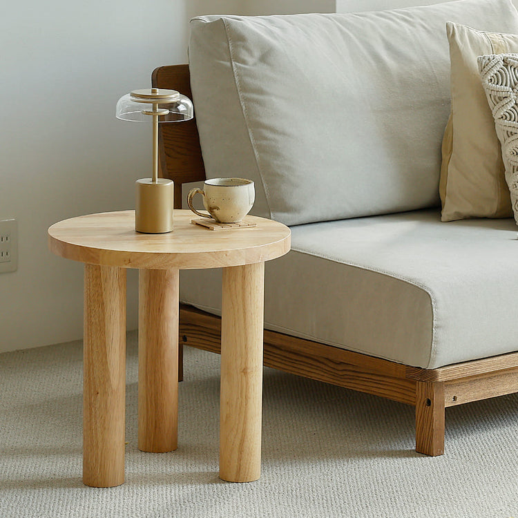 円形の天板に丸く切り出した3本の脚を足しただけのシンプルなデザインのサイドテーブル。シンプルなデザインはお部屋の空間にそっと馴染んでくれますよ。シンプルだけど、どこか温かみを感じるサイドテーブルを作りたいと思いたどり着いた意匠。天板に3本の円柱脚を足しただけのシンプルさ。でもソファーの横やベッドの横、お家の色々な場所に置いても自然と馴染むためにはシンプルさが不可欠。サイドテーブルってあればすごく便利なんだけど、どうしても必要なアイテム?って聞かれると代替になるものは意外とたくさんあるのも事実。だからこそ、このサイドテーブルは絶対お家に必要なものにしたいから、すごく自然に、そして昔から使っているかのように馴染むシンプルさを追求した結果の意匠に仕上げました。 |