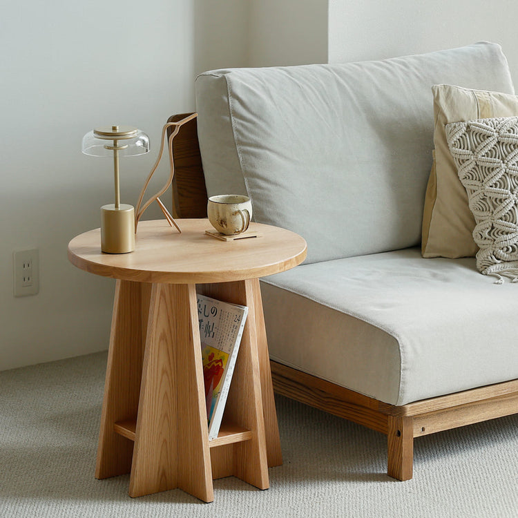レッドオーク材を使用した円形サイドテーブル。テーブルの上などに散らかりがちな雑誌などを収納するスペースがあることで整理されたお部屋の完成ですね。ソファでゆったりとくつろぐ時、近くにあると便利なサイドテーブル。一般的にソファ前にはローテーブルを置くことが多いですが、サイドテーブルはコンパクトなサイズなので部屋をすっきりと広く見せる効果があります。ソファの近くにサイドテーブルを置くと、丁度良い高さでコーヒーを飲んだり、ティータイムを楽しむことができますよ。 |